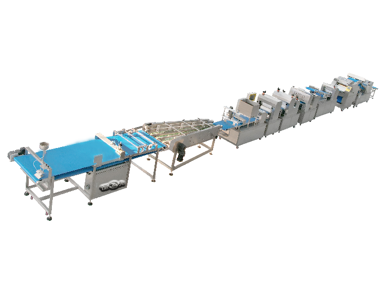 面團(tuán)輸送——延壓打薄——制成面帶——延展——制成薄皮——自動(dòng)上下抹油——自動(dòng)注餡——自動(dòng)卷型——自動(dòng)成型——上下覆膜